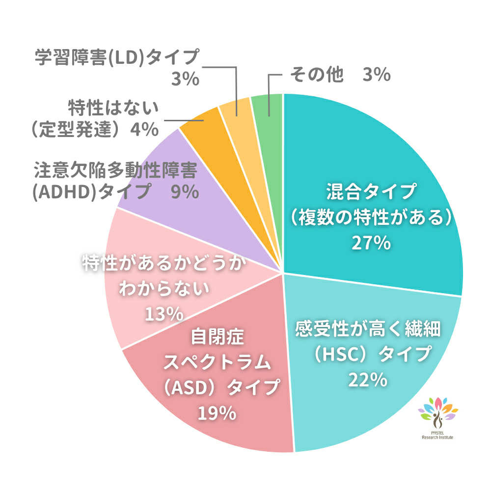 混合タイプとHSCタイプが半数近くを占め、特性が明確でないお子さんも少なくないことがわかりました。今回は、「発達に凹凸がある」「感受性が高い」子どもたちが多い層といえます。