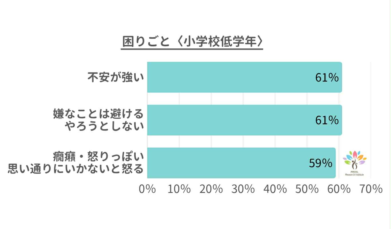 今回のアンケートでは、99.3%のお母さんが「子どもに関する何らかの困りごとがある」と回答しました。特に多かったのは、「嫌なことは避ける・やろうとしないこと」、「不安が強い」、「怒りっぽい」といった内容です。