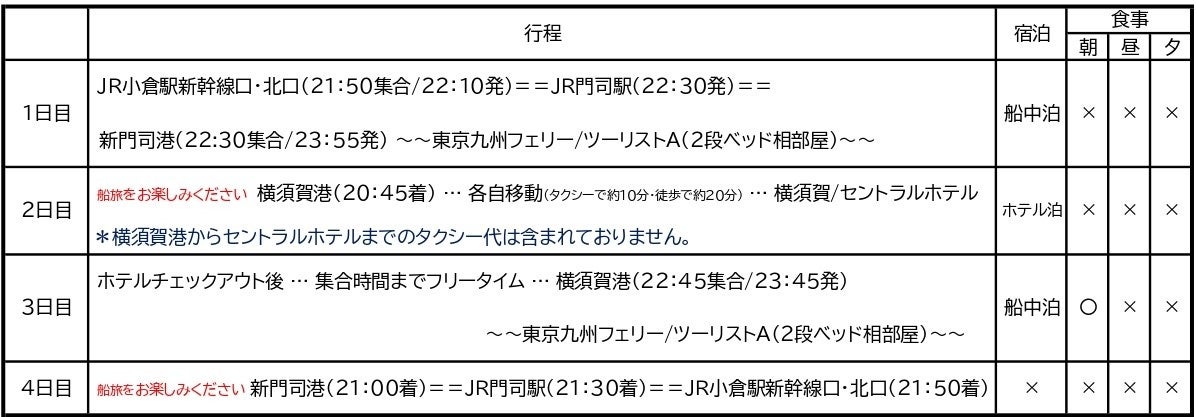 東京九州フェリー往復乗船代(基本:ツーリストA)・ホテル宿泊代・食事代(朝1回)・消費税等諸税