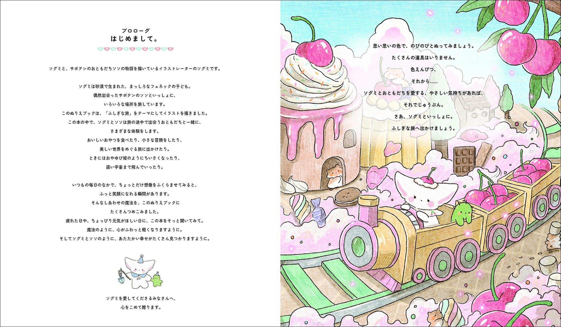 キャラクターは、愛くるしい表情のフェネックの「ソグミ」と、どこかマイペースなサボテンの「ソソ」。 人気イラストレーターの手によって生み出された、幻想的でありながらも親しみやすい独特の世界観が、一息つきたい時、気分転換にピッタリ。忙しい現代人にこそおすすめしたい癒しのぬり絵ブックです。
