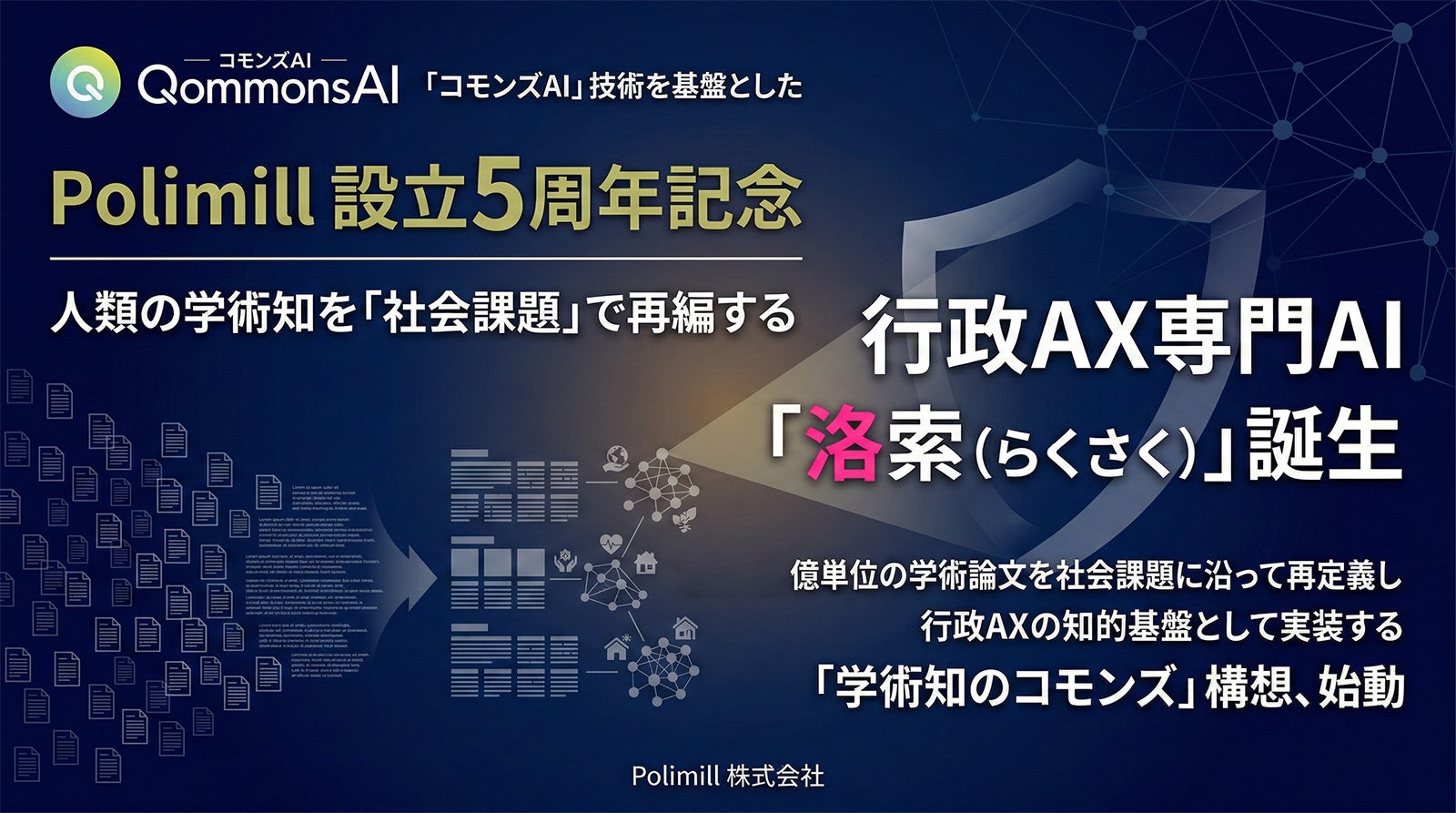 行政のAXを推進するPolimill株式会社(本社:東京都港区/代表取締役:伊藤あやめ・谷口野乃花)は、設立5周年を記念し、2026年4月より、行政AXプラットフォーム「QommonsAI(コモンズAI)」上に、専門AI「都市計画・建築・建設AI(愛称:洛索(らくさく))」をリリースいたします。「洛索」は、QommonsAIをご利用のすべての自治体に対し、無料で提供いたします。