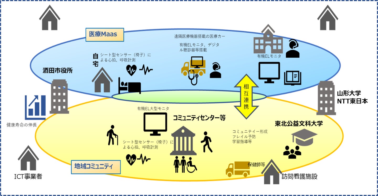 本取り組みにおいては、山形大学および医療機器販社などは、電子聴診器やエコーなどのセンサーをシステムに組み込み、より多機能な診察を可能にするとともに、多くのバイタル情報を医師に伝えることにより、リモート診察システムの診断精度を向上いたします。システムの運用は、酒田市(日本海総合病院の協力)が実証に取り組む医療Maas事業との連携を検討していきます。