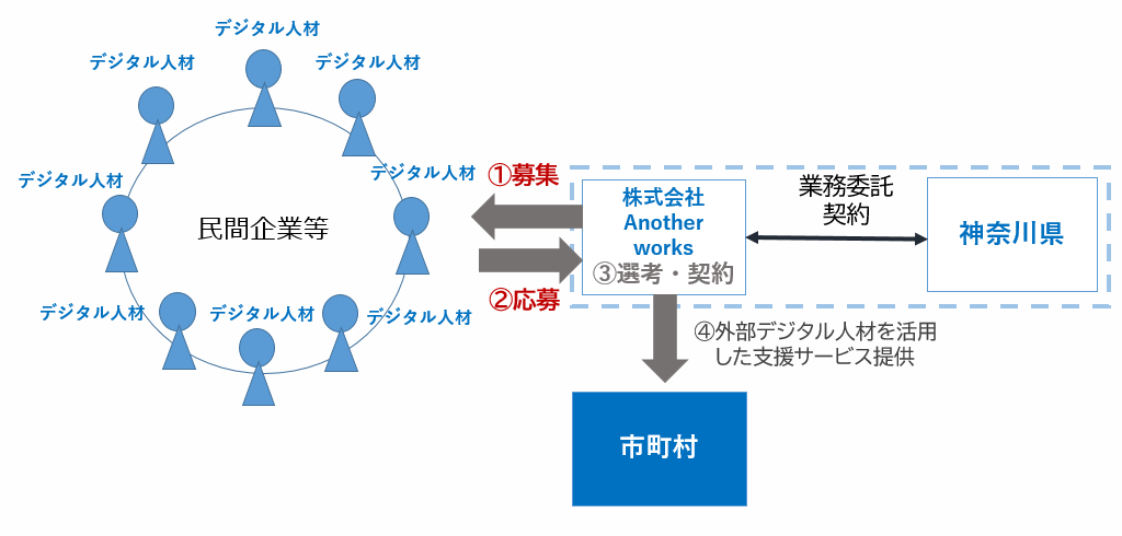 神奈川県ではこれまで、「県民目線のデジタル行政でやさしい社会の実現」に向け、県と全市町村で構成する「県市町村デジタル推進会議」や、市町村を対象とした「DX相談」などの取組により連携・支援を強化してきました。このたび、さらなる取組として、市町村のDXを加速する「外部デジタル人材」を活用した実証事業を行うため、民間企業等でのデジタル分野における高い知見や業務経験を持つ「複業人材(※1)」の募集を開始します。