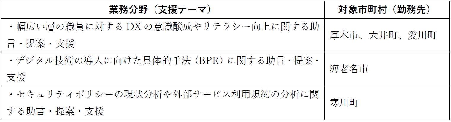 次の業務分野(3分野)及び対象市町村(5市町)に対して、約5か月間にわたり、課題解決に必要な助言や提案、支援を行っていただく人材を募集します。