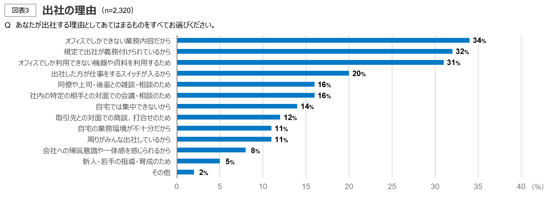 出社理由の上位3位は、「オフィスでしかできない業務内容だから」「規定で出社が義務付けられているから」「オフィスでしか利用できない機器や資料を利用するため」で、いずれも30%を超え、4位以下に10ポイント以上の差をつけている。