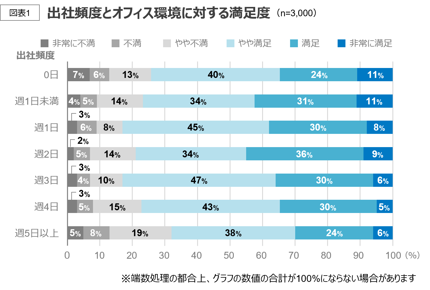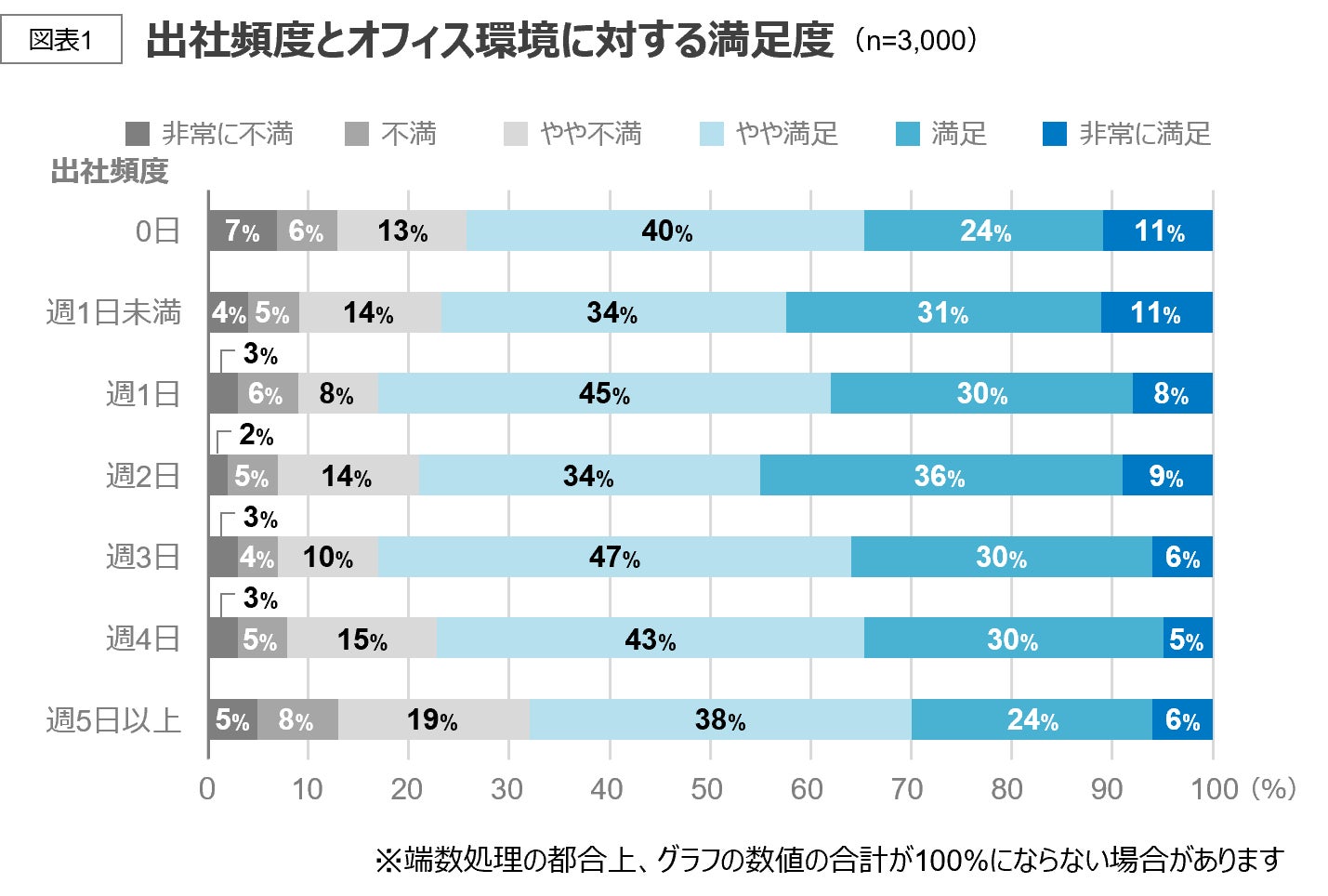 出社頻度が0日(フルリモート)と答えた人は「非常に満足」と「非常に不満」の割合がどちらも高く、オフィス環境に対する満足度の個人差が大きいことがわかる。