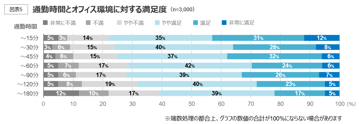 オフィス環境に対する満足度は通勤時間にも依存する。通勤時間が45分を超えるとやや不満度が高まる傾向にあり、90分を超えると「やや不満」「不満」「非常に不満」の合計が30%を上回る。ただし、満足度は出社頻度とも密接に関連するため、出社頻度が低ければ、長距離通勤による不満を和らげることが期待できる。