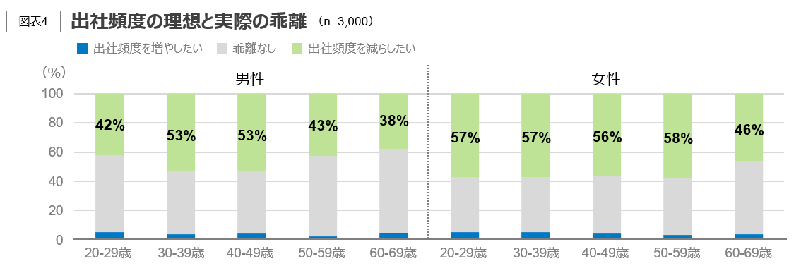 出社頻度の理想と実際の乖離は年代や性別によってやや傾向が異なり、男性は30~40代、女性は20~50代で出社頻度を減らしたい人が半数以上を占める。子育て世代を中心に、柔軟に働ける環境を求める声が多いことを反映しているとみられる。また、僅かではあるものの、出社頻度を増やしたい人も一定数いることが読み取れる。