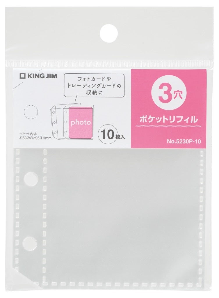 「リングファイル」をモチーフにした、キングミニオリジナルデザインのカードサイズのリングファイルです。全5色展開で色ごとに分類することができます。ポケットリフィルが10枚付属しており、別売りのポケットを追加すると最大約30枚までセットが可能です。背見出し紙の裏面は書き込み可能なシステム見出しになっており、4mm方眼のガイドがあるので、「テプラ」のラベルを貼って分類することもできます。