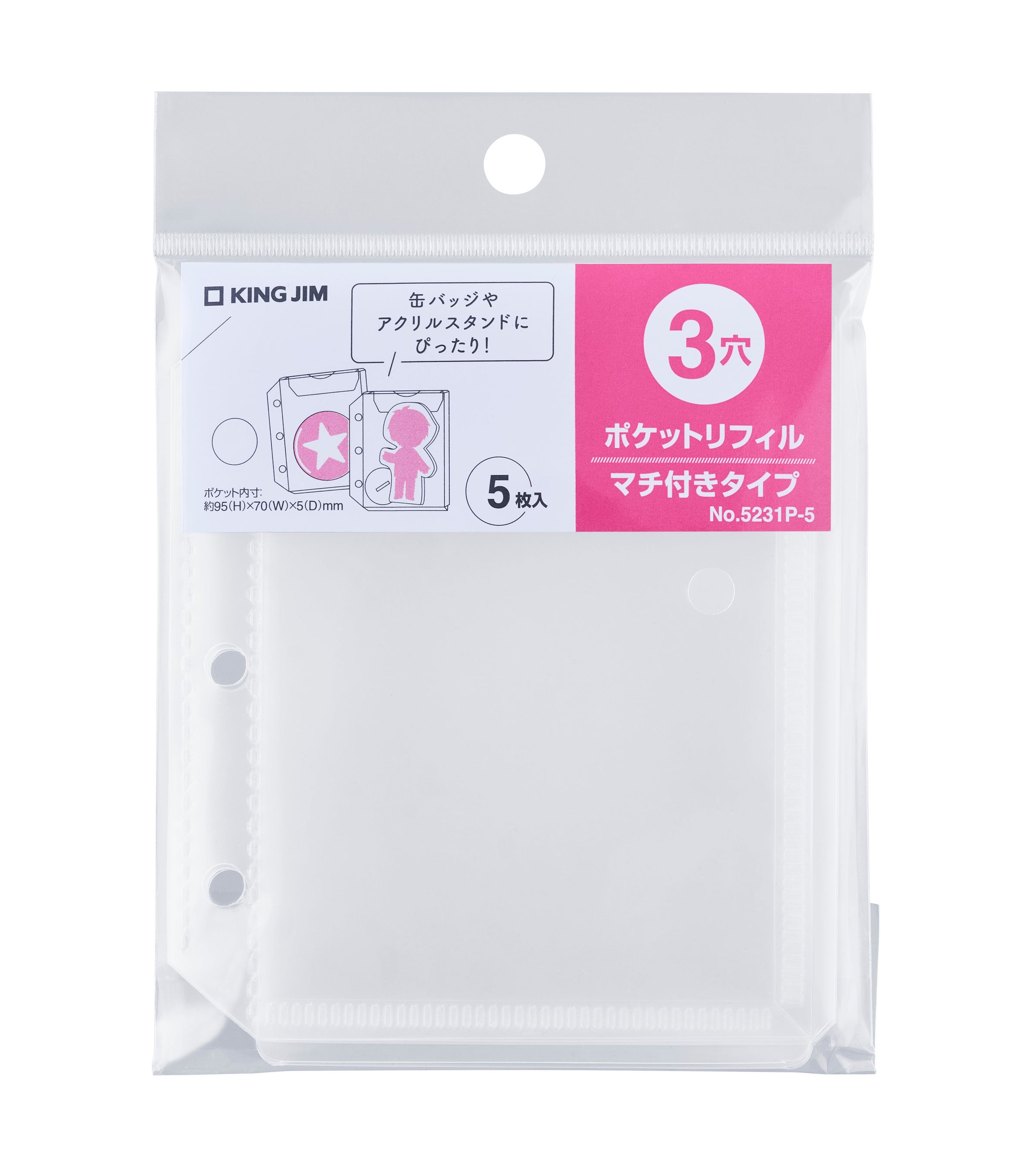 同時に発売する新たなオプション品「ポケットリフィル(3穴)マチ付きタイプ」はマチとフラップがついていて、缶バッジやアクリルスタンドなどの立体物も収納しやすく、脱落しにくくなっています。