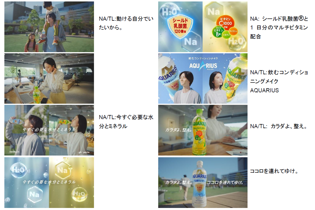 「カラダよ、整え。ココロを連れてゆけ。」をキーメッセージにした新TVCM「飲むコンディションメイク 乳酸菌ウォーター・1日分のマルチビタミン」篇(15秒)を、1月31日(月)から全国放映します。栁俊太郎さん、SUMIREさんが出演しているこのTVCMでは、職場や家族と過ごす時間で、「アクエリアス 乳酸菌ウォーター」や「アクエリアス 1日分のマルチビタミン」を飲用するシーンを描き、水分とミネラル、1日分のマルチビタミンとシールド乳酸菌®が摂取できることを伝えます。注目のシンガーソングライター・eill (エイル)さんが伸びやかな声で歌う新曲「palette」に乗せて、2つの製品が、やりたいことをすぐできるようなコンディションづくりに役立つことを伝えます。