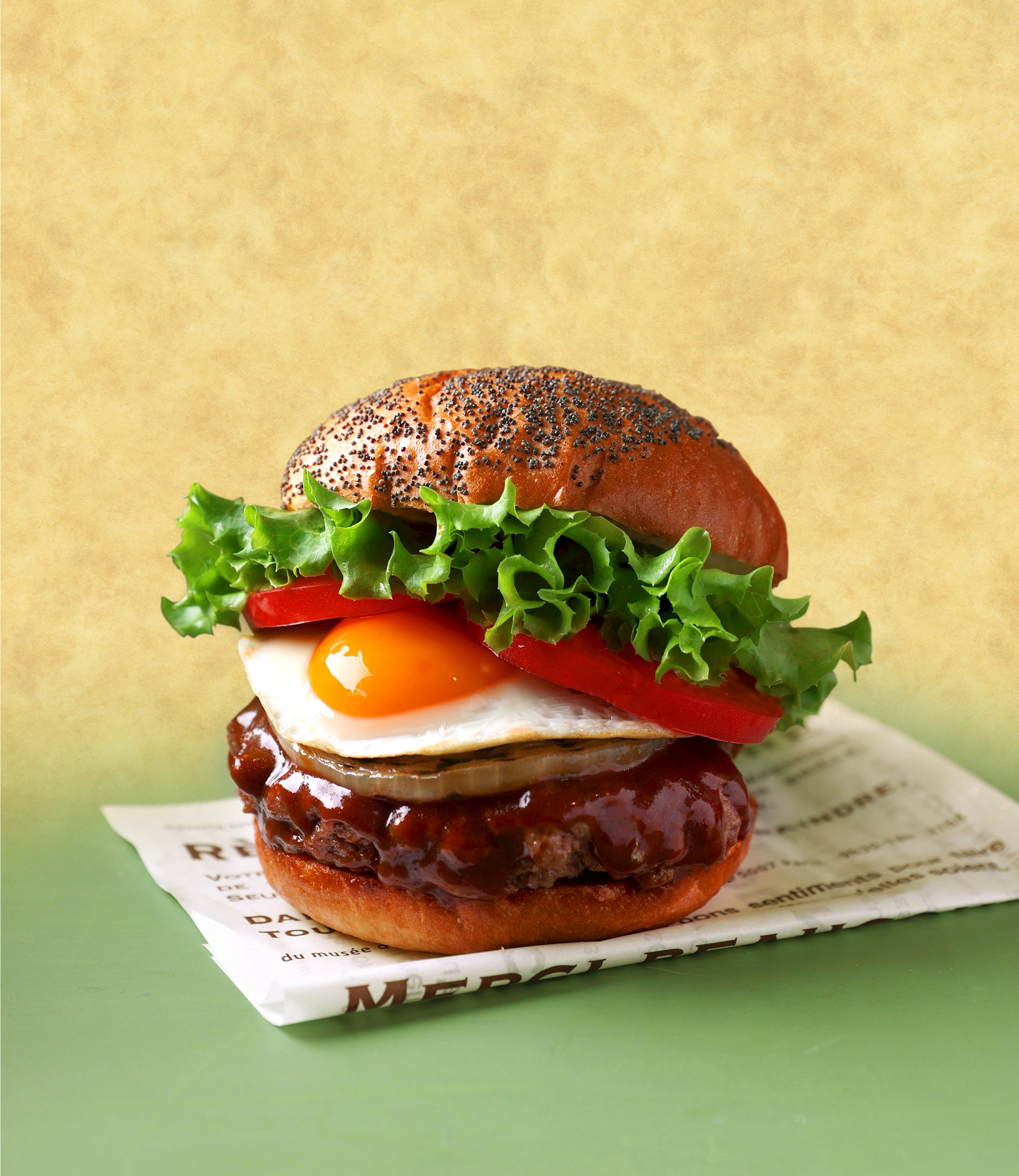詳細 : 半熟卵の目玉焼きとジューシーなビーフ100%のパティに、オニオン、レタス、トマトを合わせ、数種類の野菜とビーフスープでじっくり煮込み、香り高く仕上げた特製グレービーソースが味の決め手です。