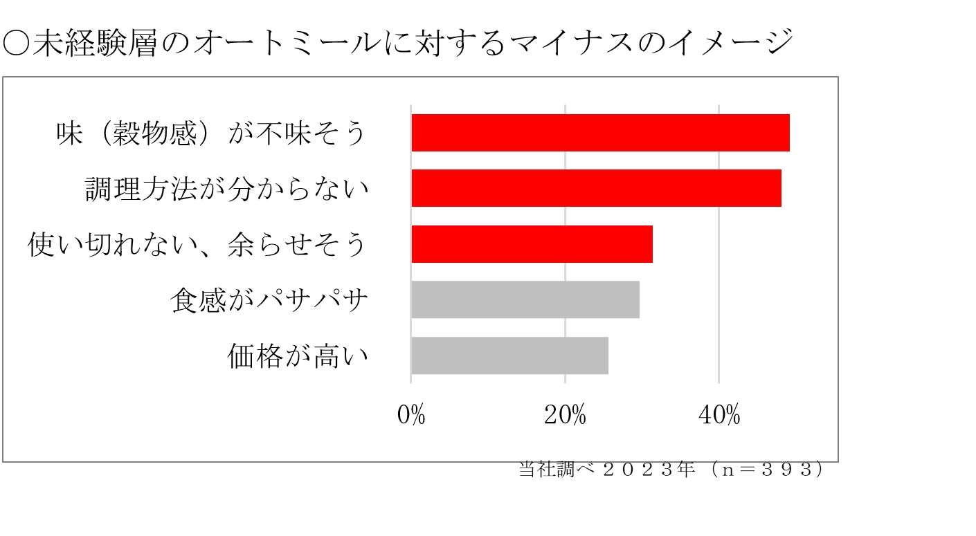 オートミールを食べたことがない方は、オートミールの「特有の味わい・食感」や「調理方法がわからない」「使い切れない量」といった点に不満・不安を感じています。