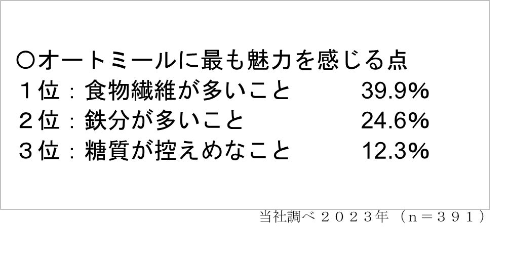 健康志向が高まる中で、オートミールに対しては、「食物繊維」「鉄分」「糖質が控えめ」といった点に魅力を感じている方が多くなっています。