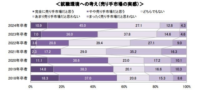 ○売り手市場だと感じる学生は全体の半数強(55.9%)。コロナ禍前と同水準に