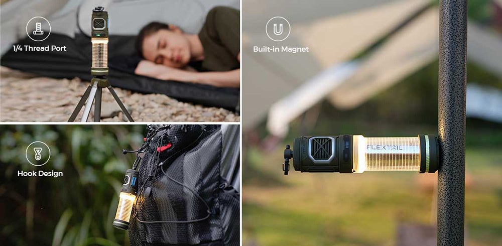 本体下部には一般的な1/4インチサイズのネジ穴付きで、三脚で立てることが可能です。上部にはバックパックやテントに取り付けができるフックが付属しており、どこでも手軽に吊るせます。また、マグネットも内蔵されており、車体やテントポールにくっ付けるなど車中泊等のシーンにも活躍します。