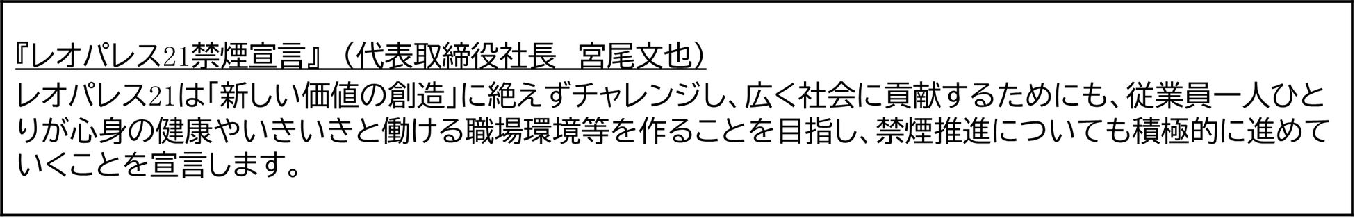 当社では、喫煙者および周囲の従業員への喫煙が及ぼす健康被害への影響を看過できないと考え、ウェルビーイング経営の重要課題として、『レオパレス21禁煙宣言』を発布し、全社を挙げて取り組んでまいります。