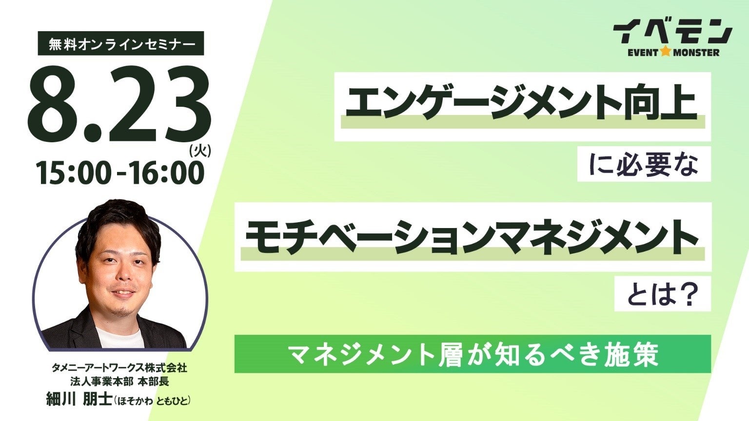 タメニー株式会社(本社:東京都品川区、代表取締役社長:佐藤茂、証券コード:東証グロース6181)のグループ会社であるタメニーアートワークス株式会社(代表取締役社長:福井秀幸)が運営する企業イベントプロデュース「イベモン」(URL:https://evemon.jp/)は、『エンゲージメント向上に必要なモチベーションマネジメントとは?マネジメント層が知るべき施策』をテーマとした無料ウェビナーを8月23日(火)に開催いたしますのでお知らせいたします。