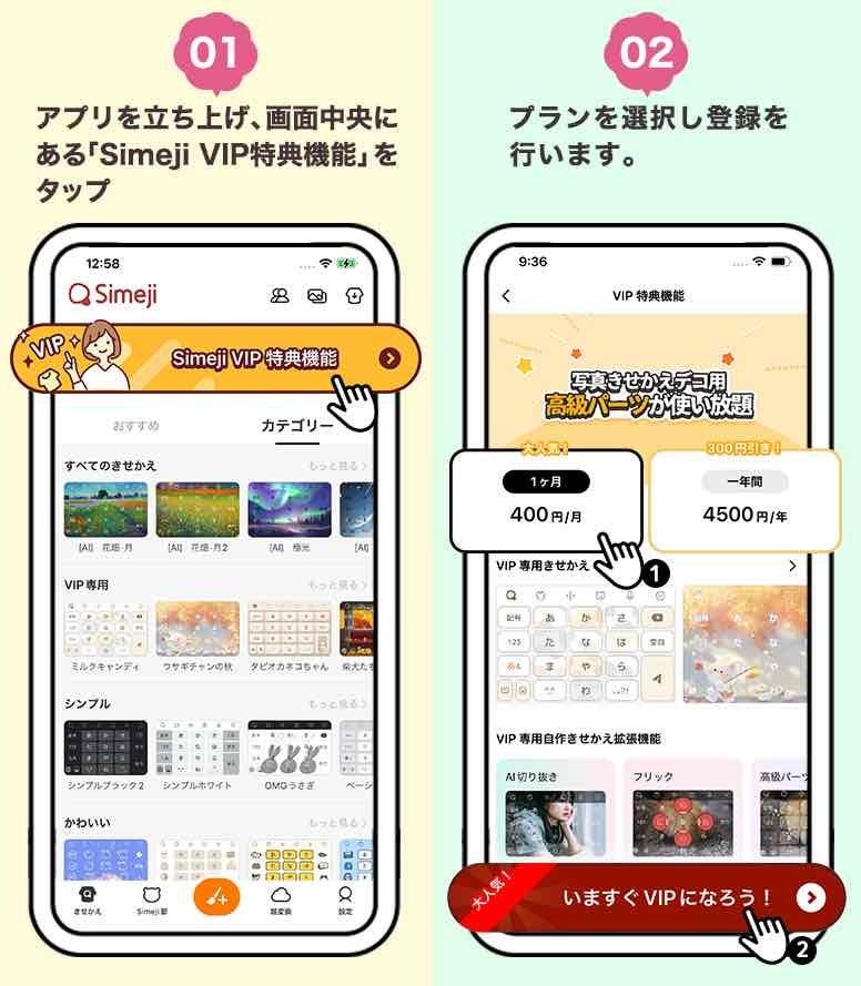 月額有料サービス「Simeji VIP」(月額400円 税込/年額4,500円 税込)は、VIP会員専用の豪華なきせかえや、キーボードのデコレーションパーツが使い放題できるなど様々な特典が盛りだくさんのサブスクリプションサービスです。
