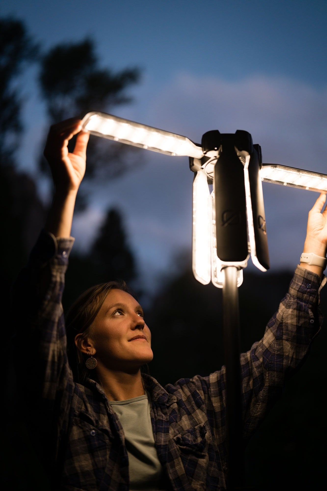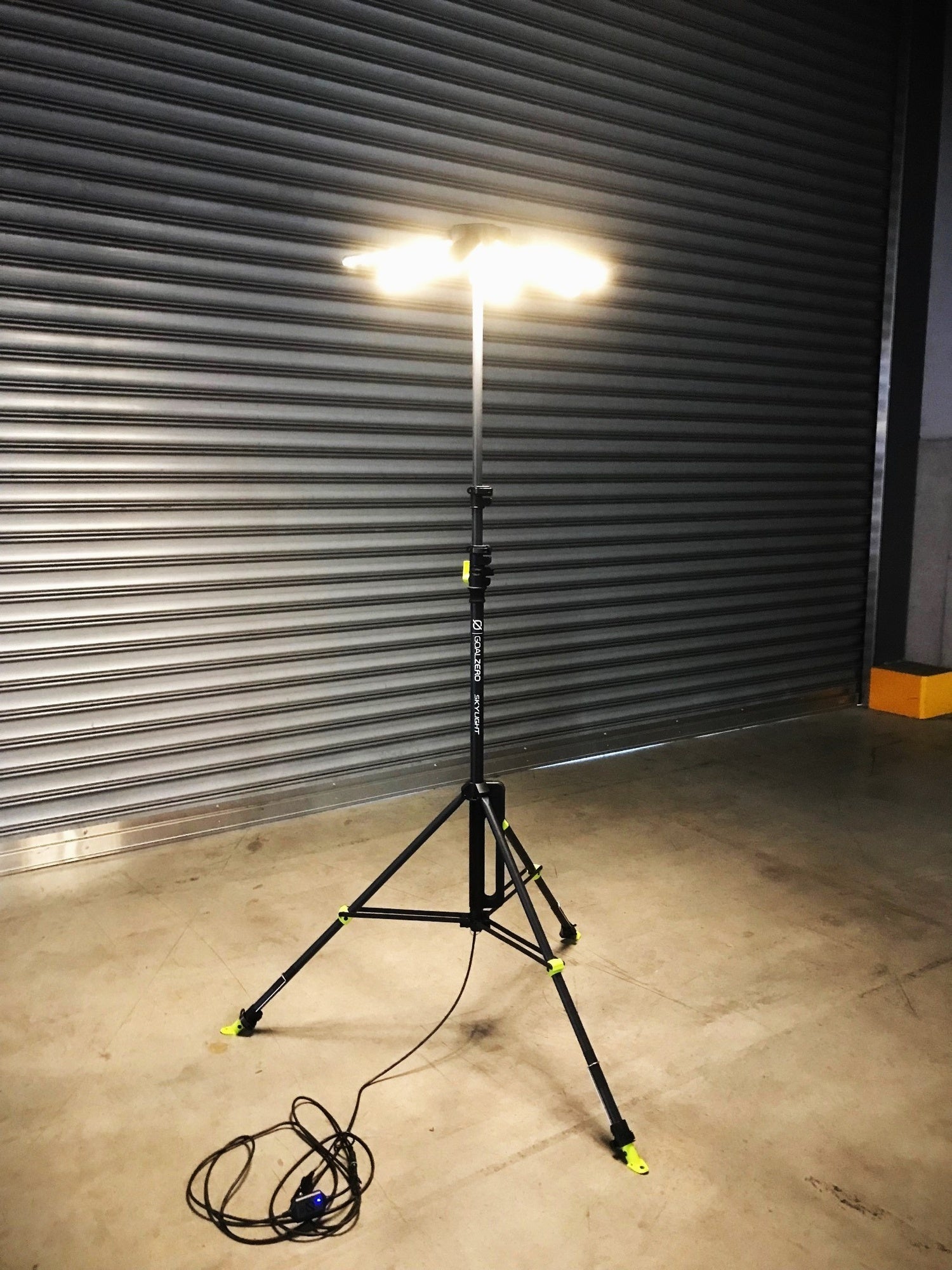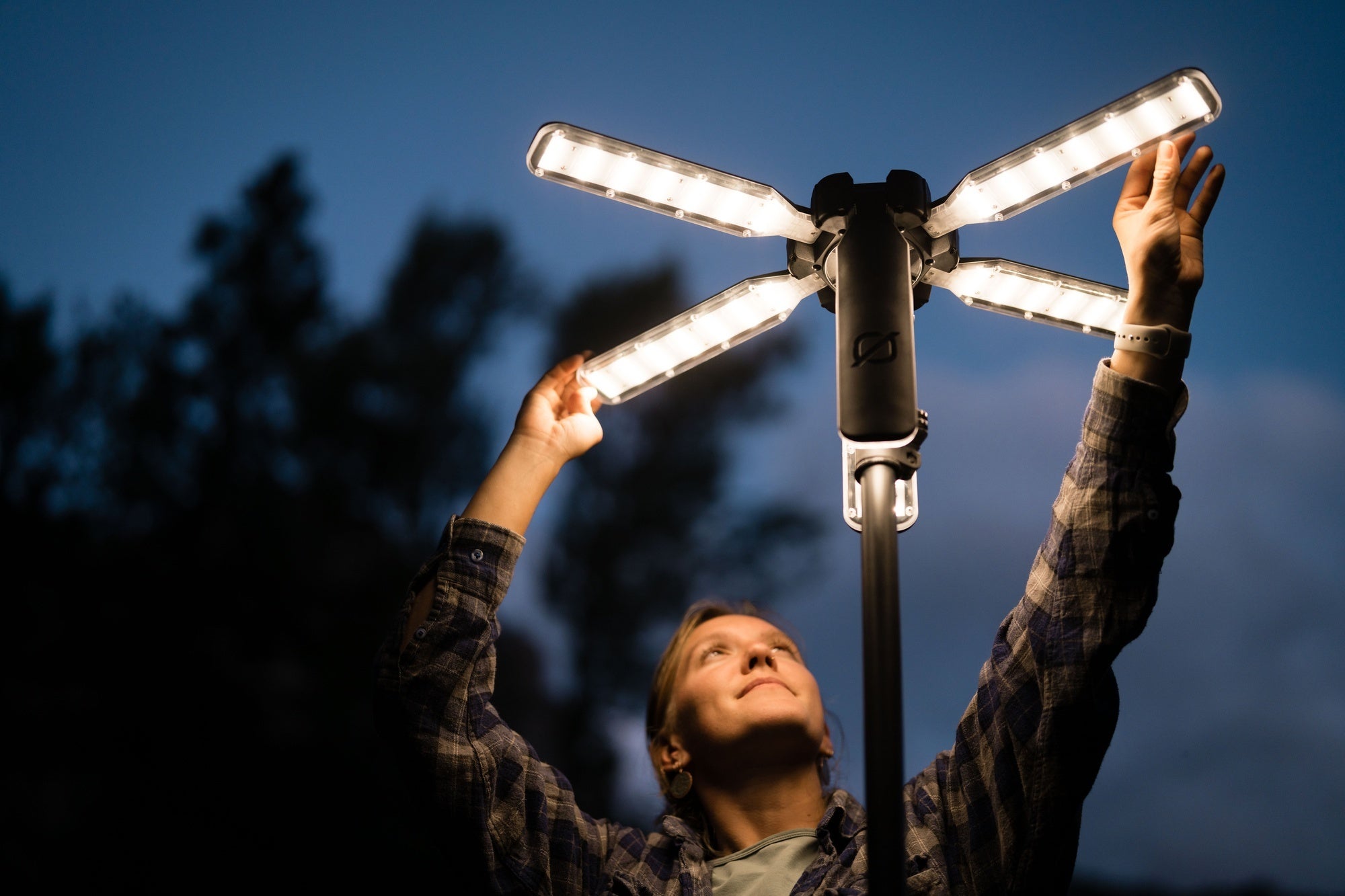 「Skylight」は、上部に角度調整可能な高光量LEDライトを6基搭載し、1台で約90mの広範囲を照らすことができる傘型のポータブルLEDライトです。コンパクトながら高光量の本製品は、12V出力が可能な同社製のYetiシリーズなどのポータブル電源を活用して駆動させる製品となっております※。