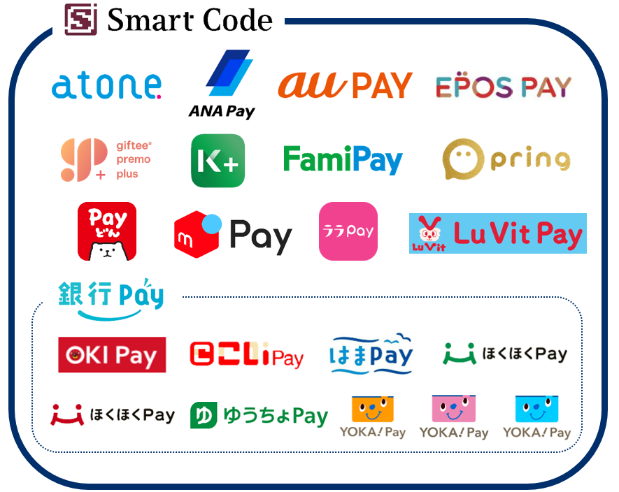 既にご利用いただける決済手段に加えて、Smart Codeを導入しているコード決済サービス「atone」「ANA Pay」「au PAY」「EPOS PAY」「ギフティプレモPlus」「銀行Pay(OKI Pay、こいPay、はまPay、ほくほくPay、ゆうちょPay、YOKA!Pay等)」「K PLUS」「FamiPay」「pring」「Payどん」「メルペイ」「ララPay」「Lu Vit Pay」が、ご利用いただけるようになります。また、今後Smart Codeを導入するコード決済サービスもご利用いただけます。