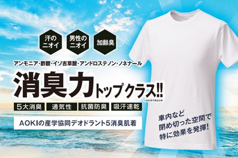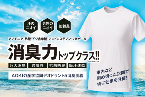 株式会社AOKI(代表取締役社長:上田雄久)は、信州大学繊維学部との産学協同で「デオドラント5消臭肌着」を2015年に発売。5つのにおい成分を消臭する「デオドラント5消臭肌着」シリーズは累計販売枚数120万枚を突破いたしました。本商品は、全国のAOKI店舗およびAOKI公式オンラインショップ(https://www.aoki-style.com/shop/itemList/?shopCode=AO-MENS&largeCategoryCode=UNDERWEAR)にて、ご購入いただけます。