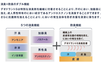 繊維に付着した消臭剤が、汗のにおい・加齢臭・男性臭のもとになる5つのにおい成分を吸着・消臭。吸着したにおい成分は洗濯で洗い流すことができるため、いつでも快適にお召いただけます。