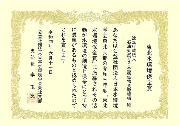 JOGMECは、岩手県八幡平市の「旧松尾鉱山新中和処理施設」(注)におけるこれまでの維持管理が、北上川の清流化に貢献する水環境保全活動として認められ、公益社団法人日本水環境学会東北支部の令和3年度「東北水環境保全賞」を受賞いたしました。