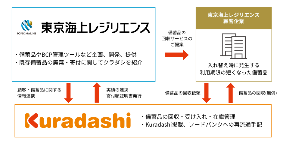 ソーシャルグッドマーケット「Kuradashi」を運営する株式会社クラダシ(本社:東京都品川区、代表取締役社長CEO:河村晃平、以下「クラダシ」)と東京海上レジリエンス株式会社(本社:東京都千代田区、代表取締役社長:生田目雅史、以下「東京海上レジリエンス」)は、企業が課題を抱える備蓄品の廃棄を抑制し、再流通・有効活用を支援する協業を2025年10月より開始しました。