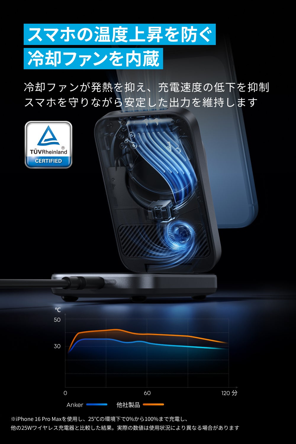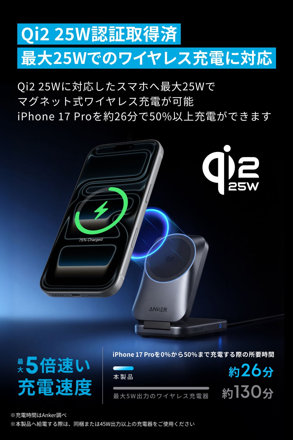 - 業界最新規格Qi2 25Wに対応:業界最新規格Qi2 25Wに対応し、最大25W出力でiPhone 17 Proを約26分で50%以上充電することができます(※ 充電時間はAnker 調べ)。