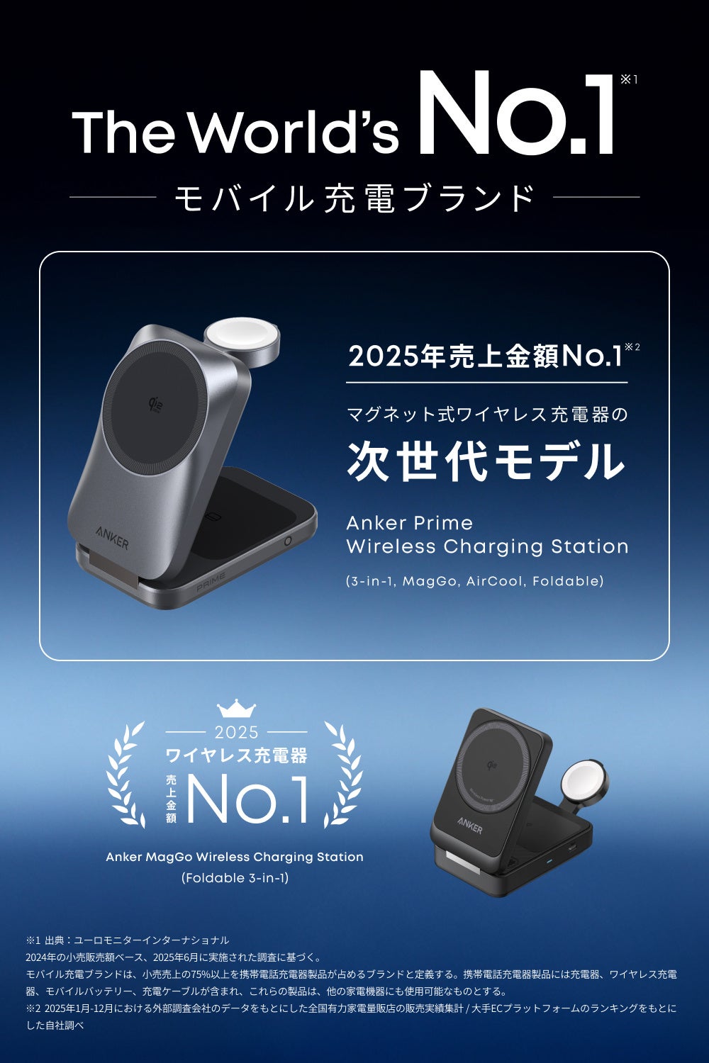 - 人気製品の次世代モデル:2025年にワイヤレス充電器カテゴリで国内売上金額No.1(※ 2025年1月〜12月における外部調査会社のデータをもとにした全国有力家電量販店の販売実績集計 / 大手ECプラットフォームのランキングをもとにした自社調べ)を達成した3-in-1ワイヤレス充電器「Anker MagGo Wireless Charging Station(Foldable 3-in-1)」の次世代モデルです。