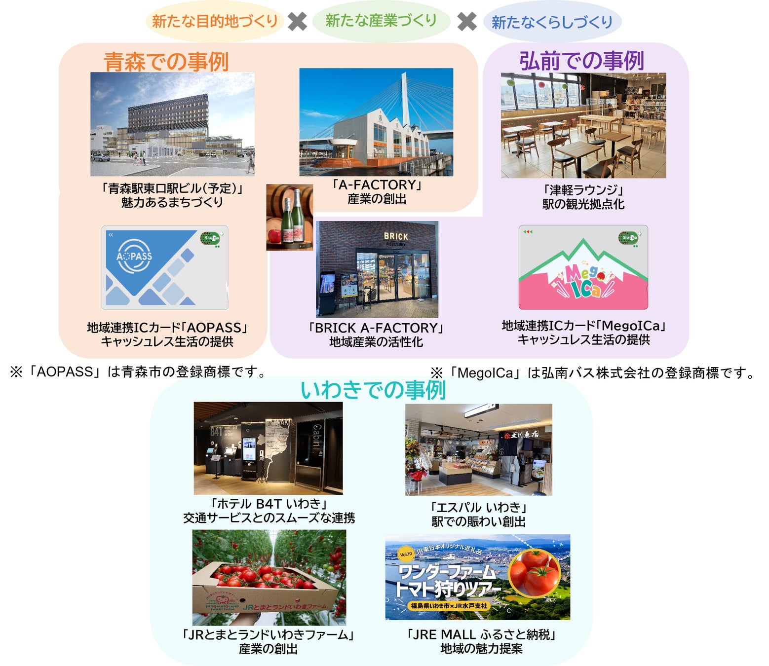 ・青森・弘前では地産のりんごを活用したシードル工場を展開し、地域産業の活性化を促進 ・地域連携ICカードにてキャッシュレス化を推進 ・いわき駅ではB4Tによる労働力不足解消を目指したホテルを運営し、地域に根差した地産物販売を行う駅ビルも開業 ・JRとまとランドいわきファームでは新たな産業の創出とJRE MALLふるさと納税による返礼品ツアーも実施 |