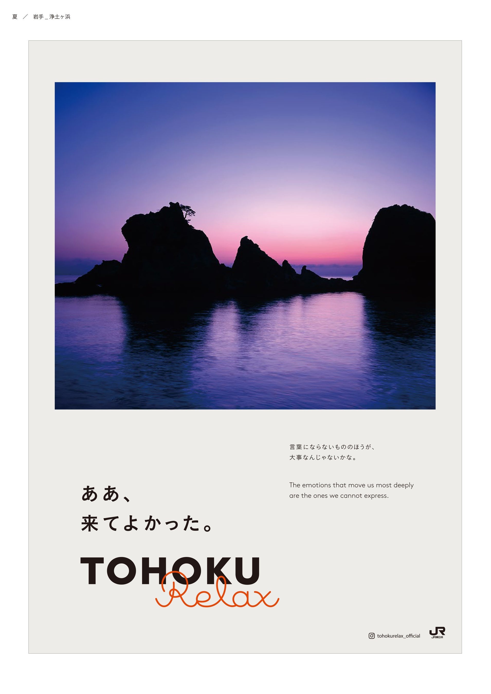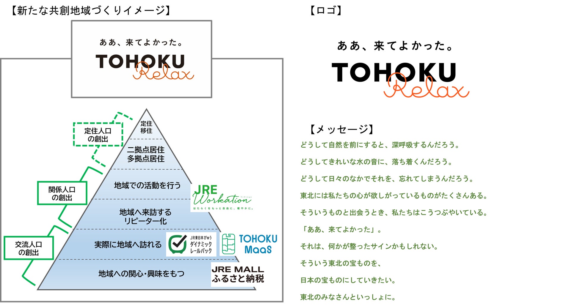 〇JR東日本グループはグループ経営ビジョン「変革2027」で掲げる「地方を豊かに」の実現に向け、JR東日本グループの資源を幅広く活用し、東北に訪れるきっかけづくり・産業づくり・くらしづくりを通じて、新たな地方創生を目指します。 〇地域の皆さまとともに東北の未来づくりに取り組むため、このたび「東北の宝ものプロジェクト」を始動します。 〇新たなブランド『TOHOKU Relax』を掲げ、そのスタートとしてこのブランドを冠して東北に数多くある「宝もの」の情報発信を行い、国内外からの流動を促進します。 |