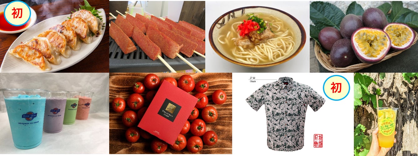 写真上:美ら園(※初出店) あぐー餃子(焼餃子) 900円、OKINAWAN BAR MAMIANA スパム串 400円、想いっきり沖縄 沖縄そば 700円、おんなの駅 なかゆくい市場 パッションフルーツ 1,300円※仕入れ状況等により価格が変更する場合があります、写真下:ブルーシール アイスシェーク 各590円、おんなの駅 なかゆくい市場 大城さんの贅沢トマトカレー 680円、月桃物語(※初出店) 紳士かりゆしウェア 10,780円、想いっきり沖縄 シークワーサーハイボール 600円