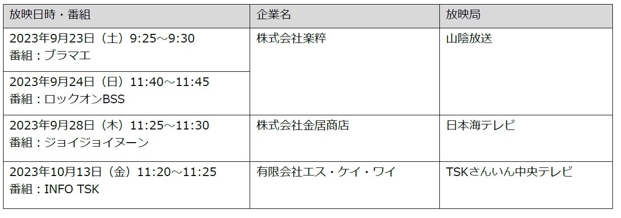 “副業の聖地 鳥取県“で誕生した先導的な副業事例を、「山陰放送」「日本海テレビ」「TSKさんいん中央テレビ」にて放映いたします。番組では、鳥取県内企業がプロ人材活用によってビジネス課題を解決に導いたノウハウや成果や、それらによって広がる可能性を発信し、鳥取県におけるプロ人材活用を浸透・加速させることを目指します。