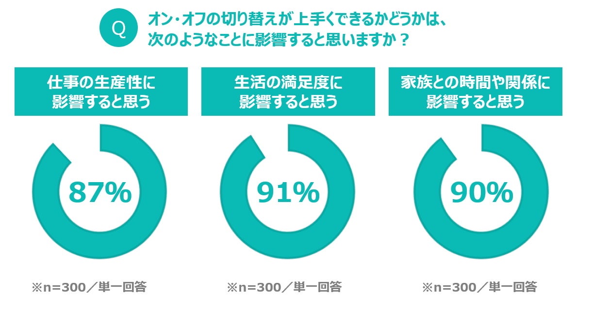 ◆一方で、オン・オフの切り替えが上手くできるかどうかは「仕事の生産性に影響すると思う」と答えた人が87%、「生活の満足度に影響すると思う」と答えた人が91%に。