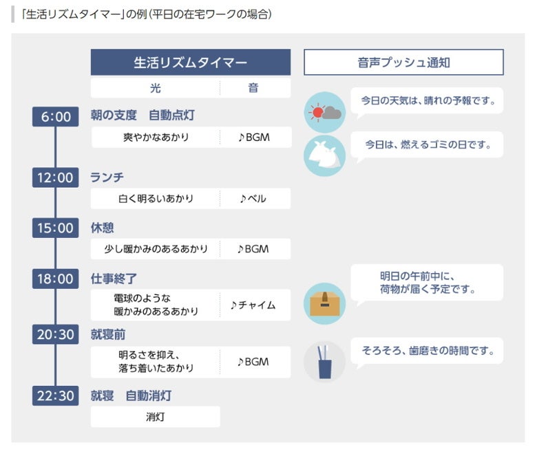 ⇒ 生活リズムタイマーであかりが自動変化&内蔵音源で時間管理