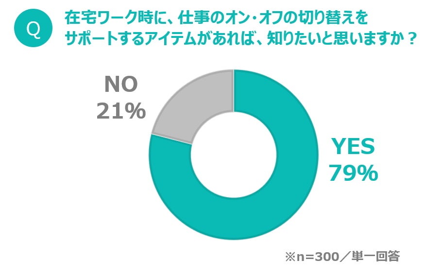 こうした結果をふまえ、「在宅ワーク時に、仕事のオン・オフの切り替えをサポートするアイテムがあれば、知りたいと思いますか?」と聞くと、約8割(79%)が「そう思う」と答えました。