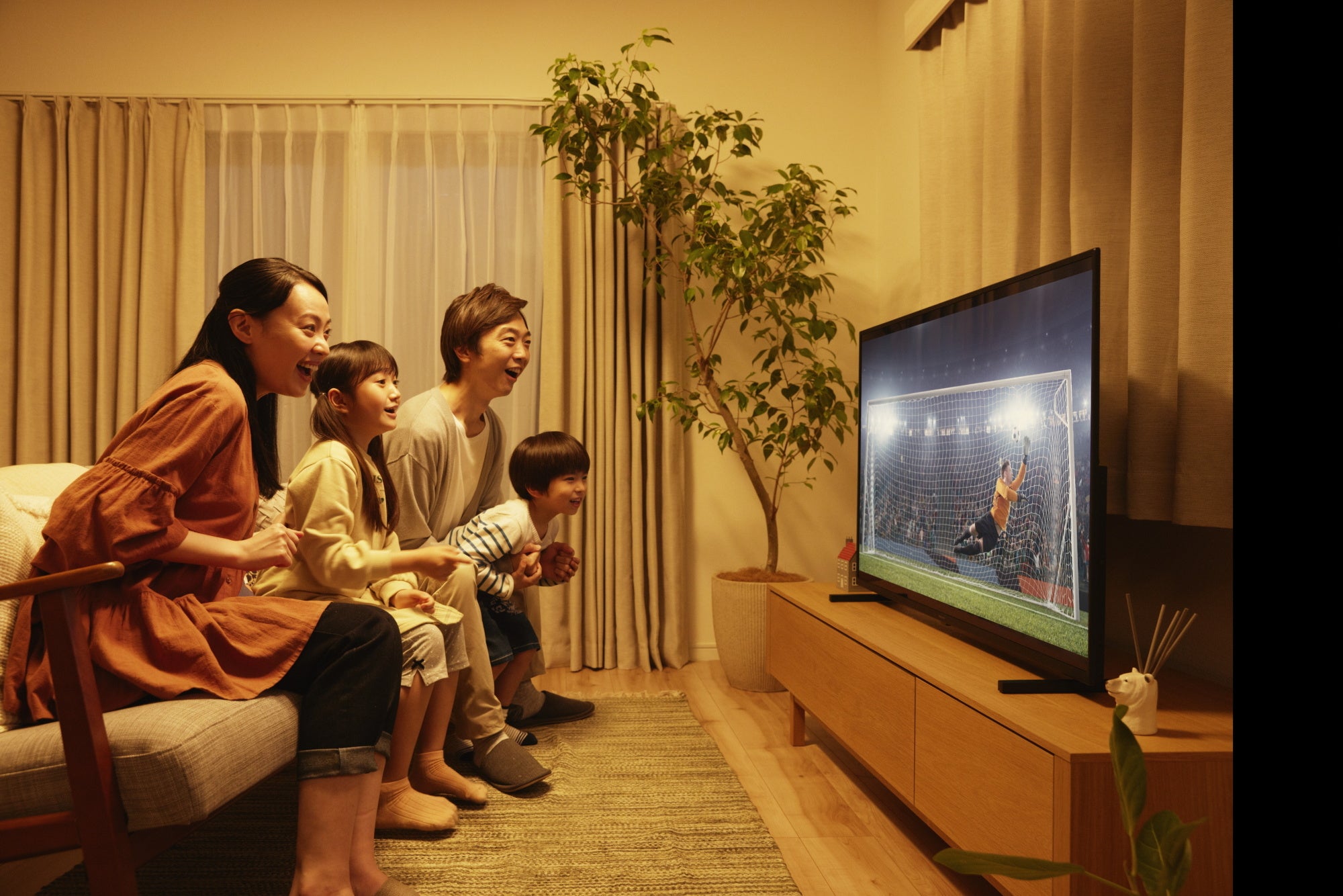 家族と過ごす団らんの時間も、ひとりで過ごす自由な時間も。ふだんの家事や在宅ワークに気分が乗らない時だって。天井から降り注ぐ光と音を組み合わせて、くらしのシーンをさまざまに演出。テレビとつないで、スマホで好きな音楽をかけて、気分を盛り上げることができます。