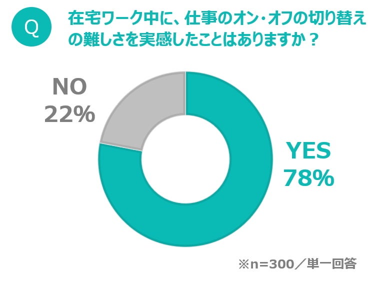 そこで、あらためて、「在宅ワーク中に、仕事のオン・オフの切り替えの難しさを実感したことはありますか?」と聞いたところ、約8割(78%)が「ある」と回答。時間の区切りや気持ちのメリハリがつけづらい在宅ワーク中は、「オン・オフ下手」状態に陥りやすいと言えそうです。