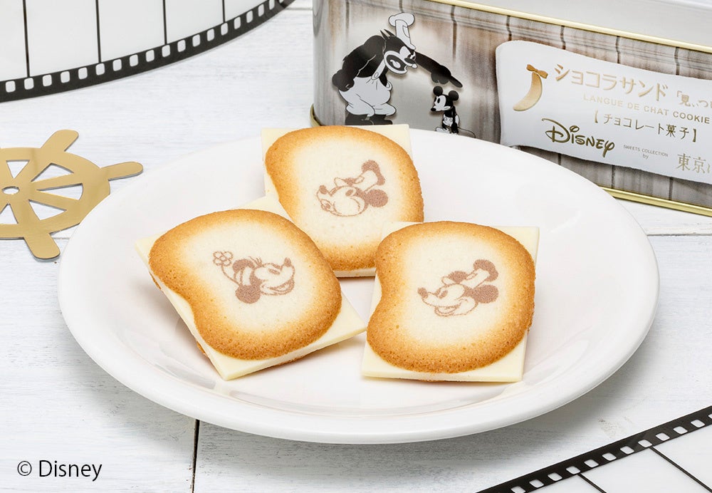 シャリシャリッと軽やかに焼きあげたラングドシャクッキーには、楽しそうな表情のミッキーマウスが描かれています。絵柄は3種類ありますので、どれが出るかはお楽しみ。東京ばな奈が最高のミルキー感を目指して作りあげた“おいしいバナナミルクシェイク味のショコラ”を、はみだすほど大きくサンドしました。かんだとたんお口いっぱいにミルキー感が広がります。