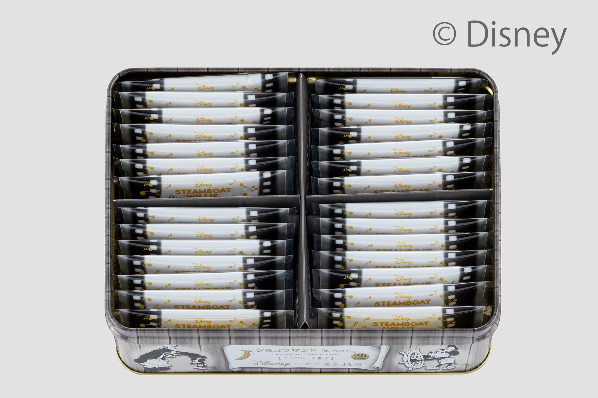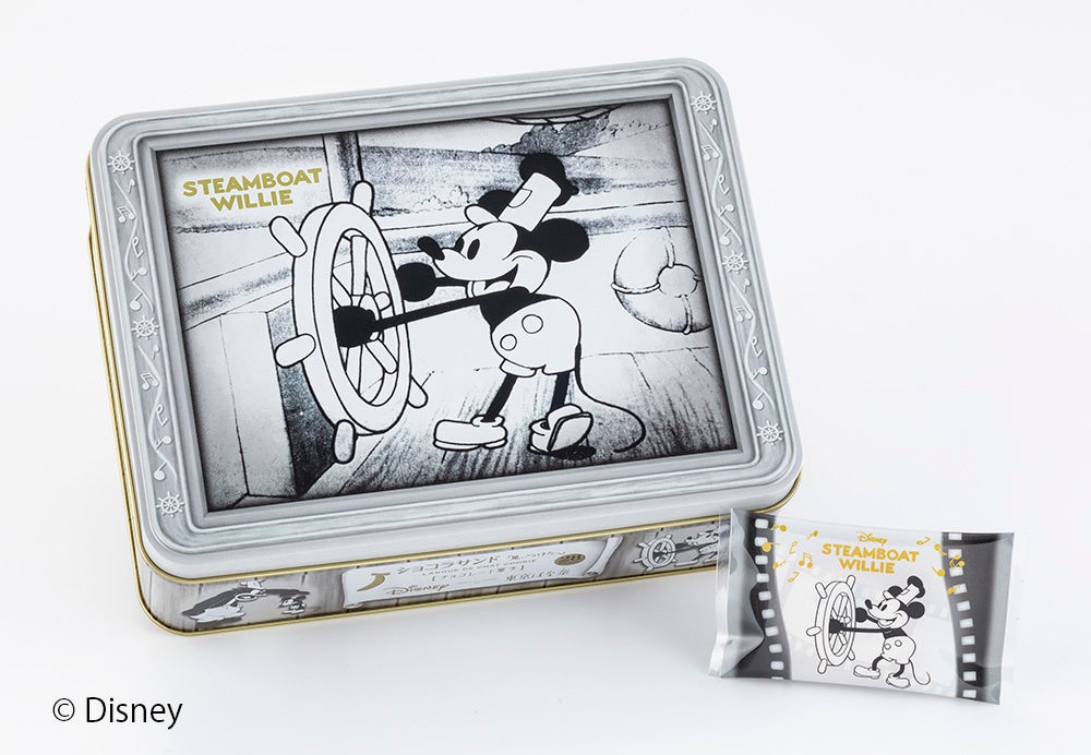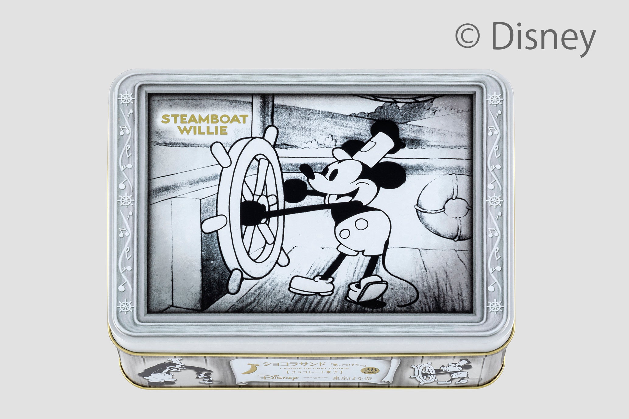 最新作の『ディズニー 蒸気船ウィリー/ショコラサンド「見ぃつけたっ」』は、ミッキーマウスの記念すべきスクリーンデビュー作である『蒸気船ウィリー』をテーマにしたスペシャル缶です。劇中でも印象的な、ミッキーマウスがご機嫌に船を操縦する様子を描いたデザインに仕上げました。スクリーンをそのまま切り取ったようなモノトーンカラーが、クールな可愛らしさに。今しか手に入らないスペシャルスイーツで、ぜひお召し上がりください!