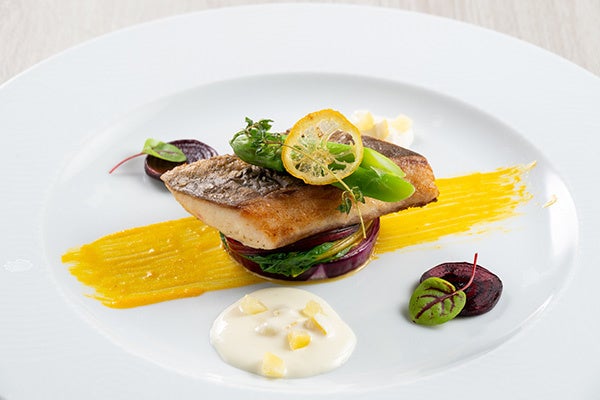 ふっくらと焼き上げた魚に、自家製の塩レモンを使用したシンプルかつさっぱりとしたクリームソースを添えて提供します。