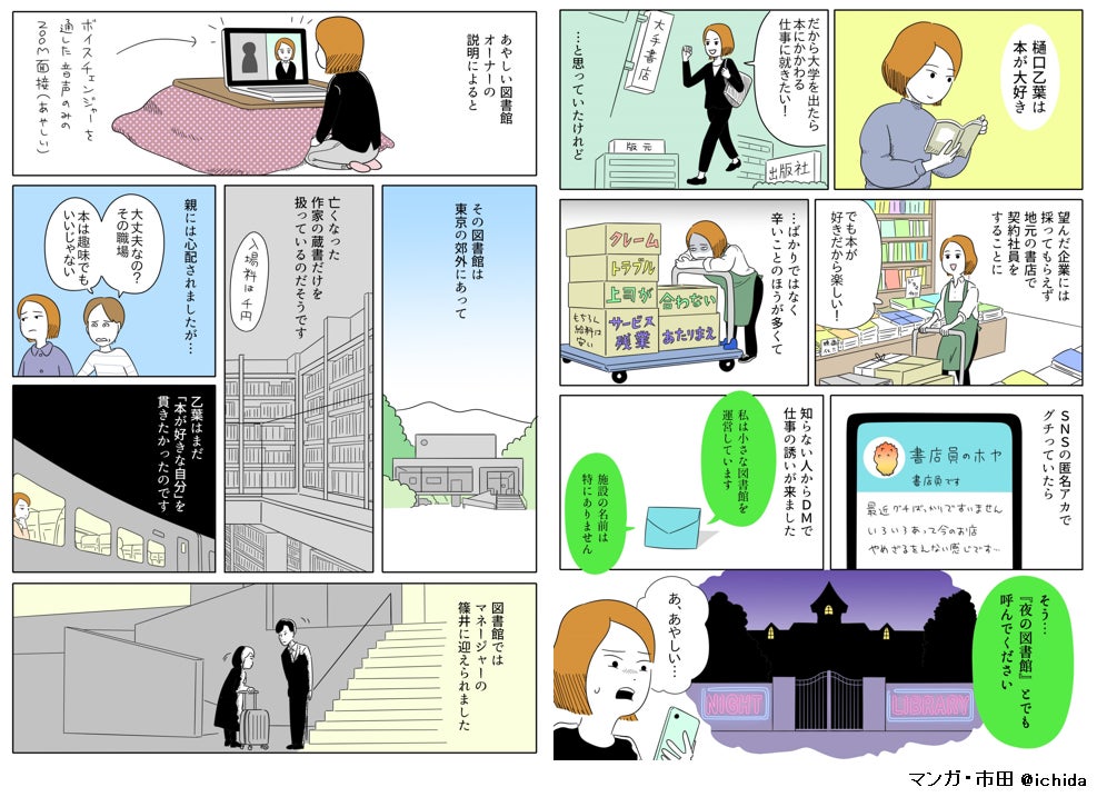 東北の書店に勤めるもののうまく行かず、書店の仕事を辞めようかと思っていた樋口乙葉は、SNSで知った、東京の郊外にある「夜の図書館」で働くことになる。そこは普通の図書館と異なり、開館時間が夕方7時〜12時までで、そして亡くなった作家の蔵書が集められた、いわば本の博物館のような図書館だった。乙葉は「夜の図書館」で予想外の事件に遭遇しながら、「働くこと」について考えていく。