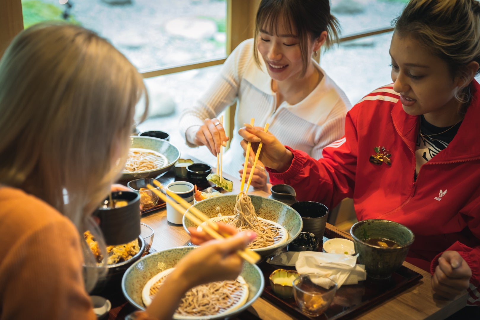 上州名物「おっきりこみうどん」や「黒毛和牛すき焼き」を提供する『里山本陣』、店内製麺の十割そばを味わえる『十割そば 囲炉裏』、フランス料理やパンケーキを楽しめる『シカモアカフェテラス』、全天候型BBQやステーキを提供する『バーベキュー&ステーキハウス スミテラス』など、滞在スタイルやその日の気分に合わせてお選びいただけます。