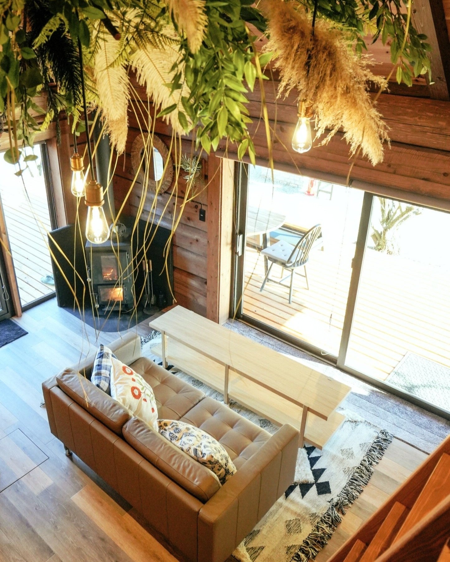 コテージ室内は、大きな窓から荒神山の自然を望む開放的な設計。昼はやわらかな自然光に包まれ、夜は薪ストーブの炎を囲む穏やかな時間が流れます。木のぬくもりを感じる空間で、ご夫婦やカップルはもちろん、大切なご友人との語らいのひとときをお楽しみいただけます。