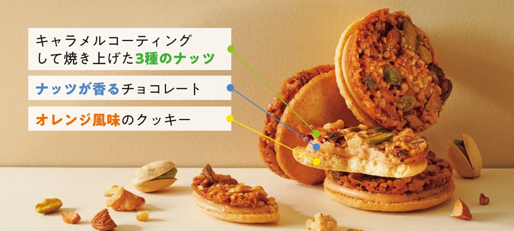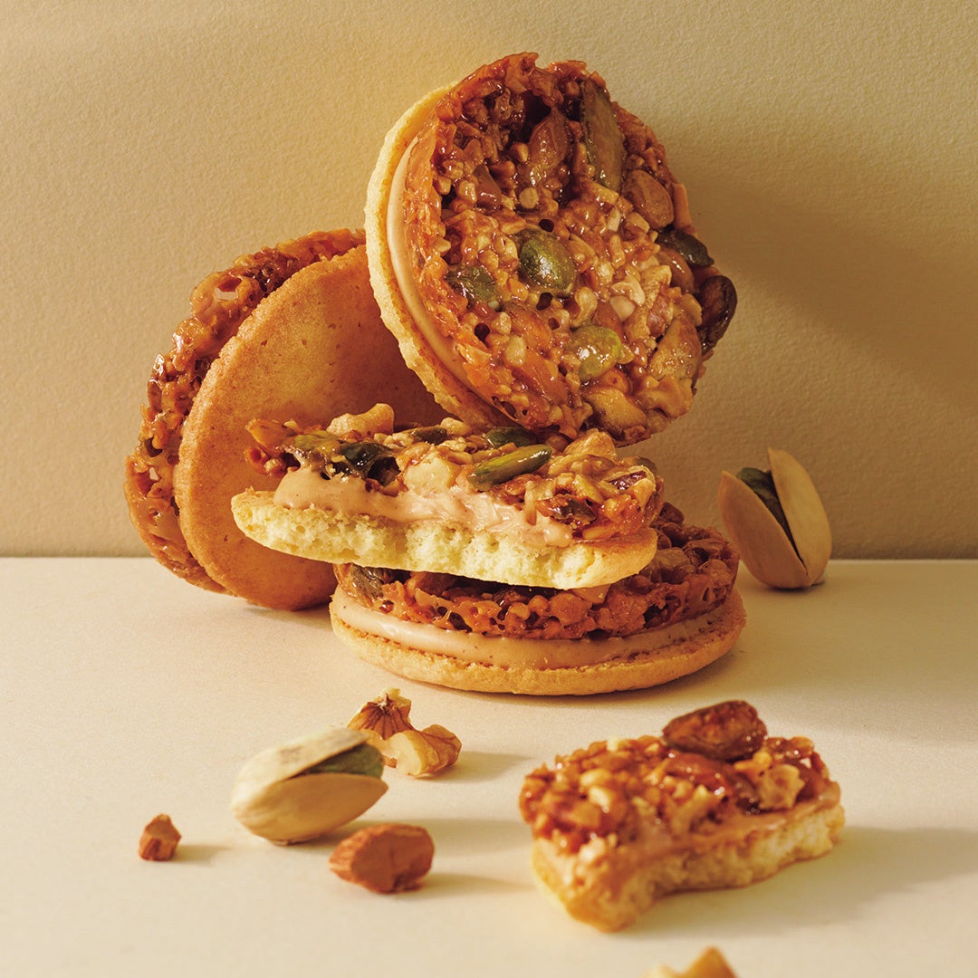 キャラメルコーティングして焼き上げたピスタチオ・アーモンド・くるみの3種のナッツと、オレンジの風味がさわやかなクッキーで、ナッツが香るまろやかなチョコレートをサンド。ザクザクとした食感と、3層のバランスが絶妙なフロランタンです。