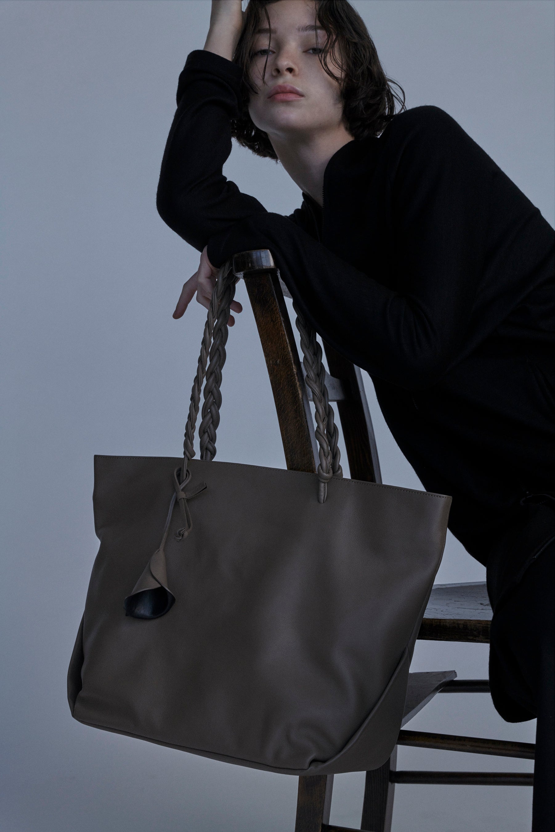 ハンドルがレザー紐で編まれたトート。底からサイドに紙を折ったような造作が、マチュアなレザーに硬質でコンテンポラリーな佇まいを加えています。<ディスコード ヨウジヤマモト>のユニークネスを加えた、遊び心のある機能的なデザインをより楽しんでいただけるコレクション。