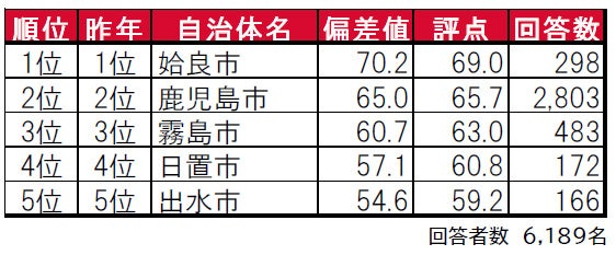 TOP5は昨年と変わらず、鹿児島市とその周辺自治体などが上位に並ぶ結果となっています。