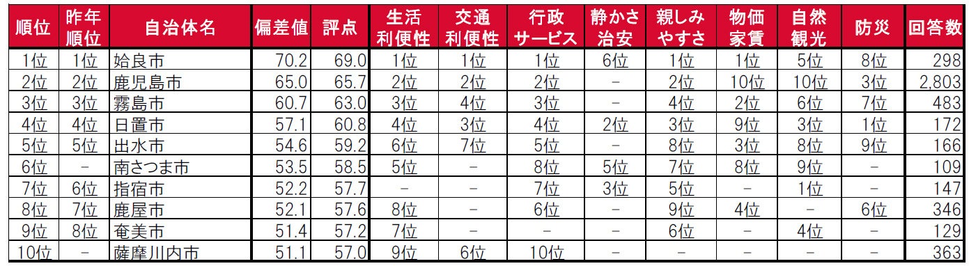 - 街の住みここちランキング2022<鹿児島県版>自治体TOP10 因子別順位